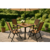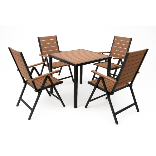 Zahradní nábytek v sestavě jednoho stolečku a čtyř pohodlných křesel zútulní každou terasu nebo pergolu. Konstrukce nábytku je z lehkého hliníku, deska stolu a sedací částí křesel z odolného kompozitního materiálu, který se postará o jeho dlouhou životnost při minimální údržbě. Materiál je velmi odolný povětrnostním vlivům a UV záření a bude zdobit Vaši zahradu po dlouhá léta. Jedná se o výbornou imitaci vzhledu dřeva teak.