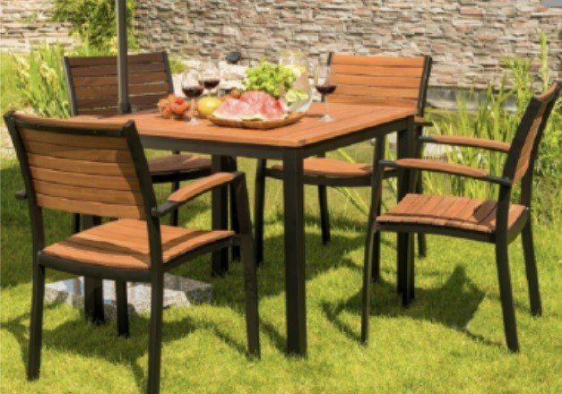 Zahradní nábytek v sestavě jednoho stolečku a čtyř pohodlných židlí zútulní každou terasu nebo pergolu. Židle jsou stohovatelné a mimo sezonu zaberou minimum prostoru. Konstrukce nábytku je z lehkého hliníku, deska stolu a sedací částí křesel z odolného kompozitního materiálu, který se postará o jeho dlouhou životnost při minimální údržbě. Materiál je velmi odolný povětrnostním vlivům a UV záření a bude zdobit Vaši zahradu po dlouhá léta.