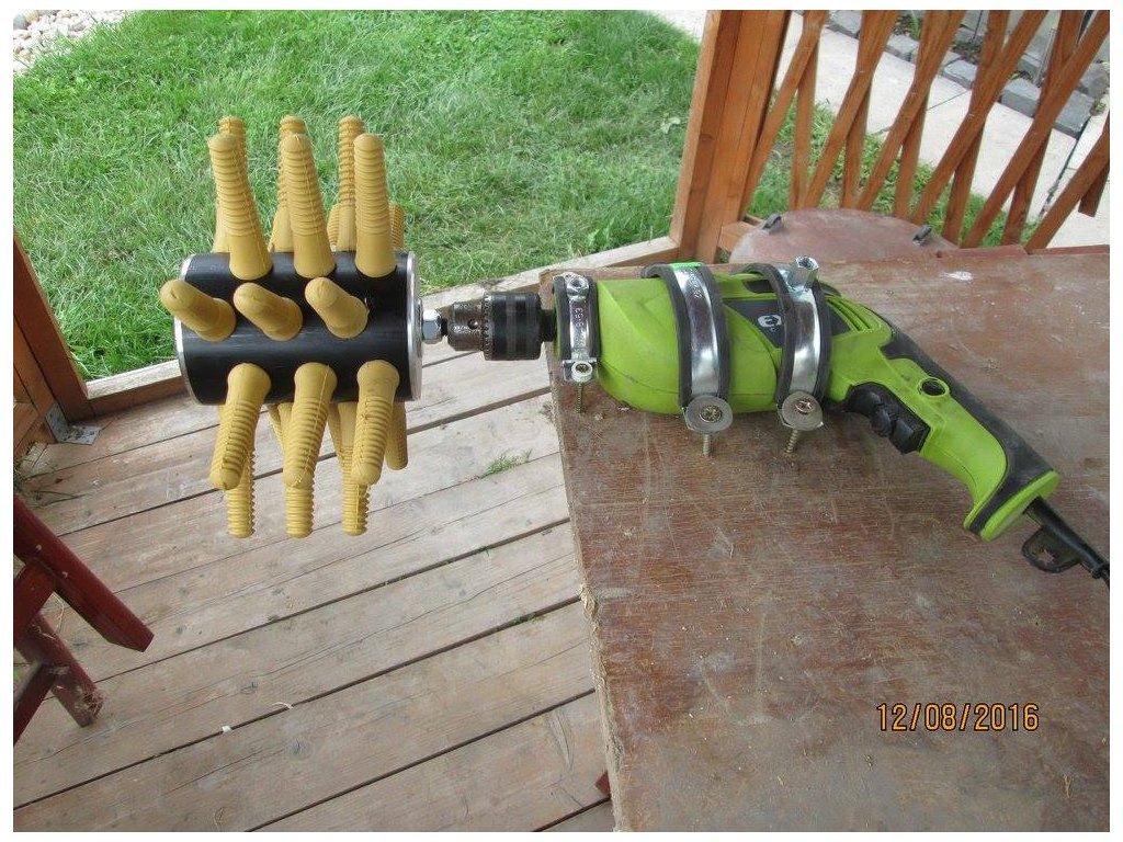 Instalace škubačky drůbeže na vrtačku s ochranným krytem a stojanem:
