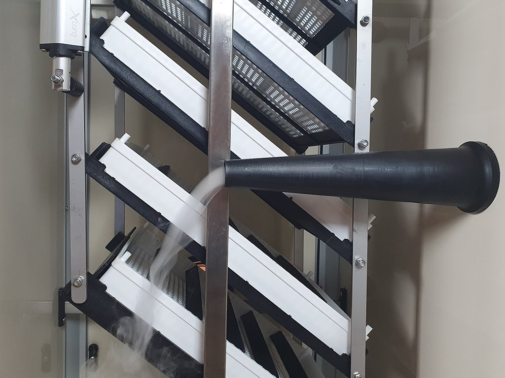 Otáčení vajec v líhni je zajištěno pomocí automatického systému pro otáčení vajec TurnX. Pomocí tohoto systému jsou vejce pravidelně a velmi jemně otáčena v 1 hodinových intervalech. Systém TurnX je vyroben z chromové oceli a je velmi jednoduchý na údržbu. Motor systému je napájen pomocí samostatného adaptéru s velmi nízkou spotřebou. Součástí balení jsou univerzální rošty na různé druhy vajec. V těchto roštech je možné líhnout různé velikosti vajec (od křepelčích až po husí vejce), které se umísťují do roštu a upevní se za pomoci dělících lišt, které jsou samozřejmě součástí balení - ke každému roštu je v balení 10ks dělících lišt.