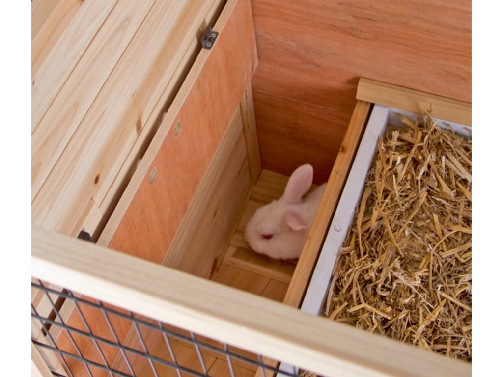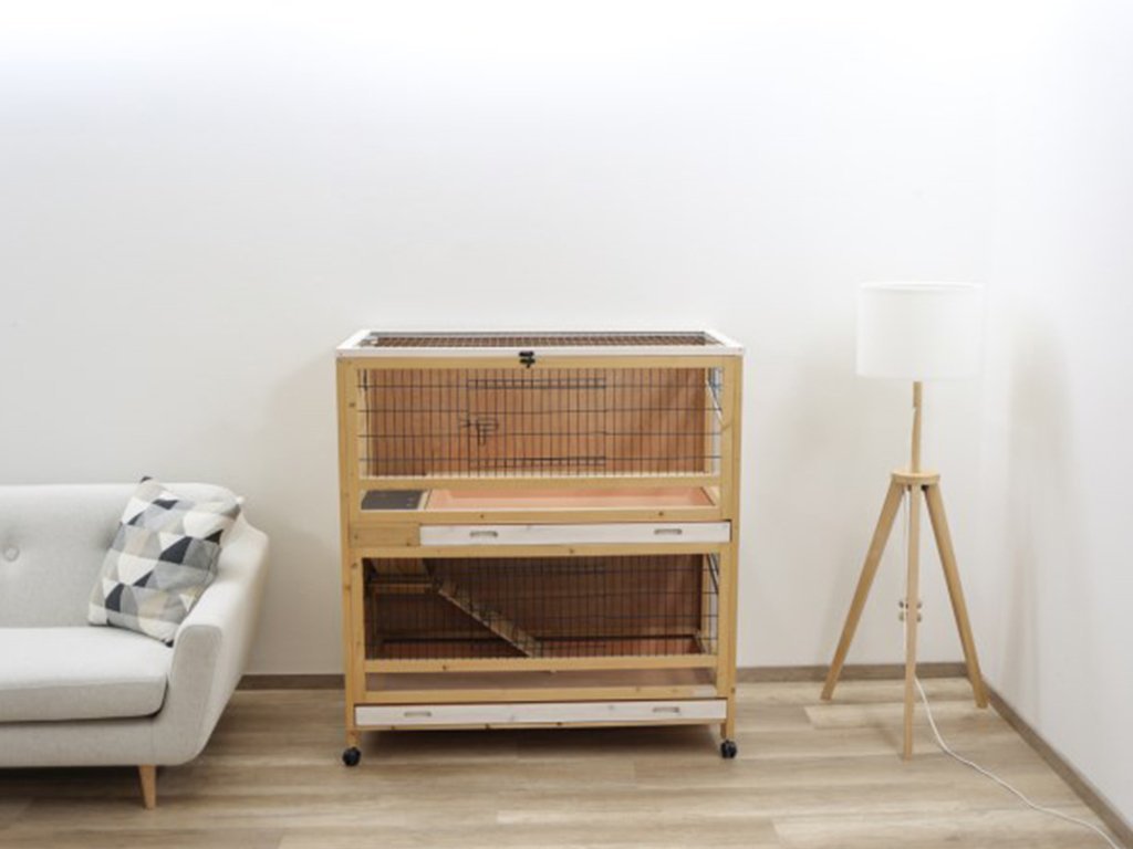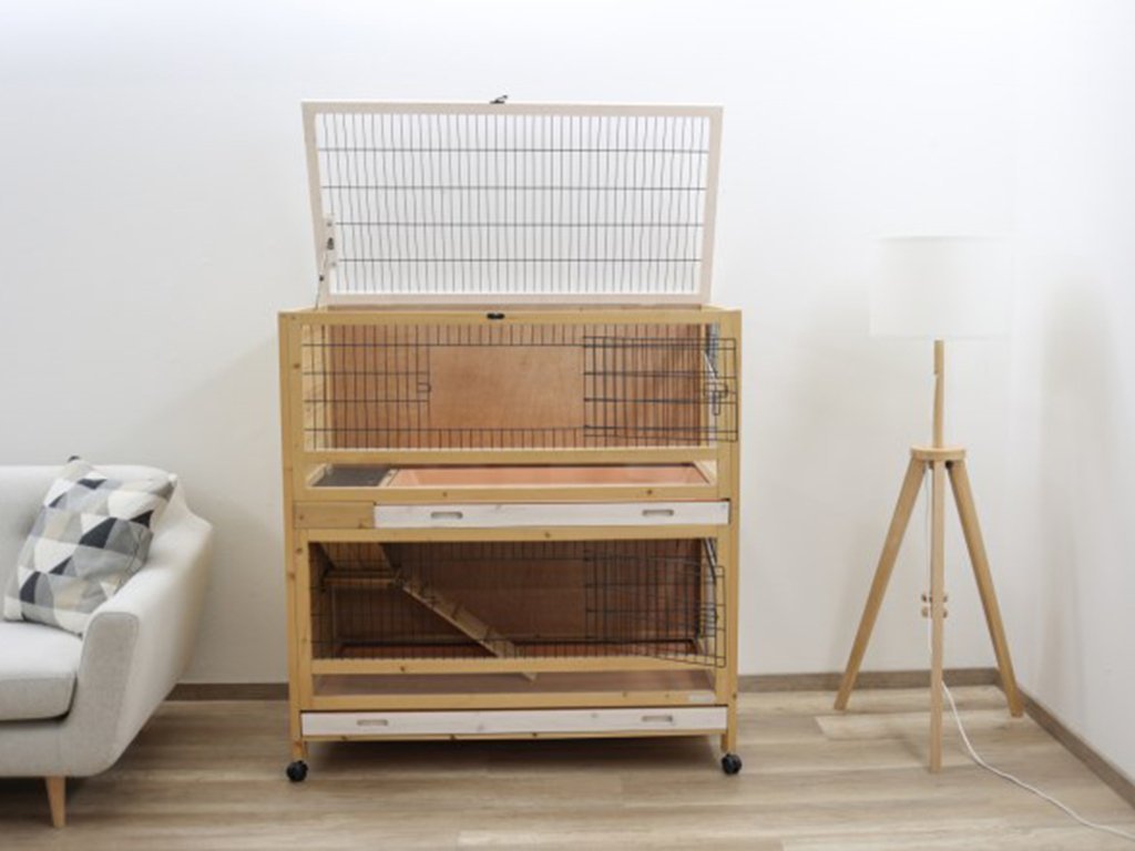 Dvoupatrová klec vyrobena ze dřeva má hmotnost cca 35 kg. Ve spodní části každého patra klece je umístěno plexisklo, které snižuje vypadávání hoblin z klece. Zbytek klece je pro dobrý výhled vyroben z kvalitní mřížky o síle drátu 2 mm s roztečí drátu 14 mm. Klec pro králíky a další hlodavce je určena pro umístění do vnitřních prostor. Dřevěná klec je povrchově ošetřena základním ochranným nátěrem. Pro delší životnost je třeba, jako u každého dřeva, ochranný nátěr obnovovat.