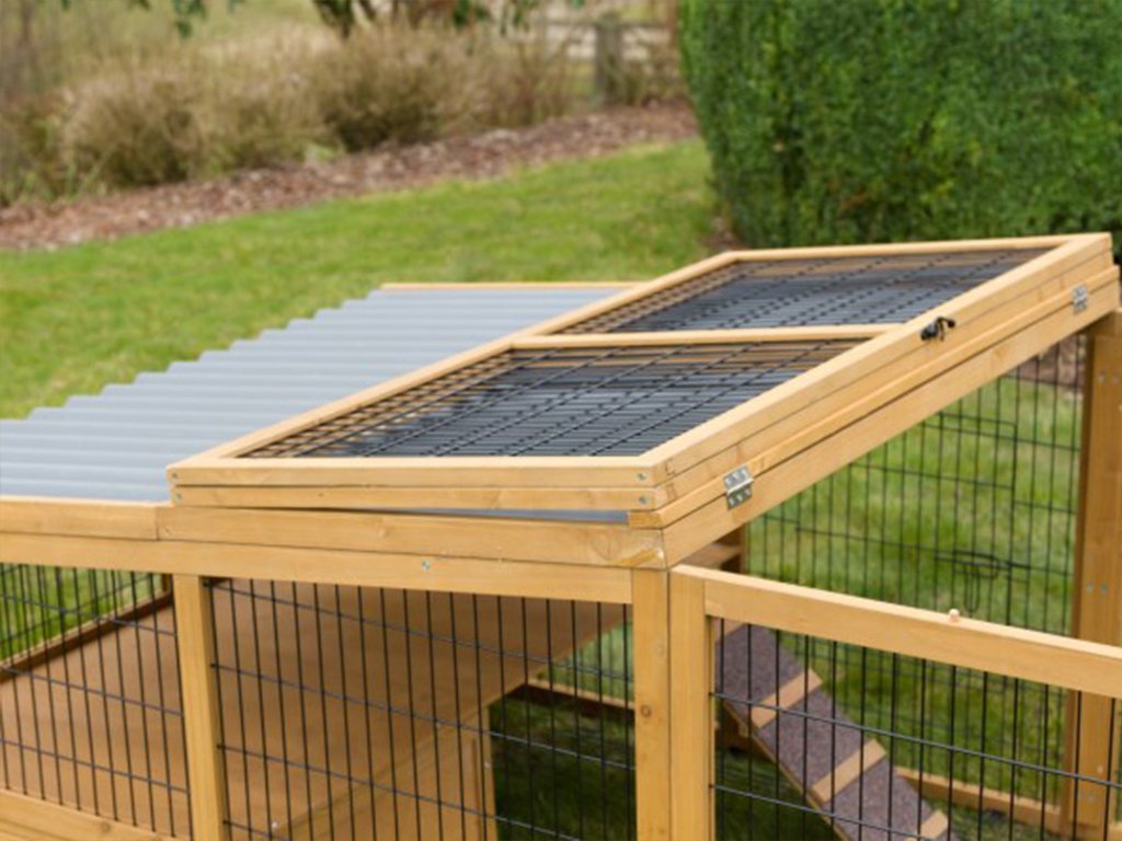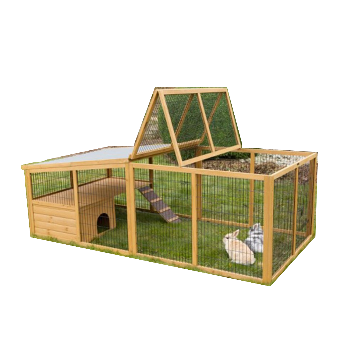 Výběh poskytne králíkům naprosté pohodlí a bezpečí, ale zároveň také volnost v přírodě. Králík může trávit čas v domečku, na vyvýšené odpočinkové plošině, na kterou má neustále přístup přes schůdky nebo ve volném výběhu na zelené trávě. Ke svému mazlíčkovi budete mít snadný přístup přes dvoje dvířka (jedny jsou u odpočinkového místa a druhé na čelní straně výběhu) a přes vrchní část výběhu, kterou můžete odklopit do několika poloh. Stěny a střecha výběhu zabraňuje vyskočení a nabízí ochranu před nezvanými hosty, jako jsou např. dravci, kočky nebo kuny. Nemusíte se bát, že se králík pod dřevěným výběhem podhrabe, jelikož po obvodu celého výběhu je z vnitřní části výběh chráněn pletivem.
