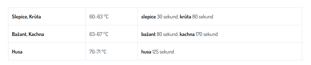 Před škubáním je nutné drůbež správně spařit. Nepřekračujte teplotu a dobu ponoření drůbeže. Delší čas ponoření může způsobit vaření některých částí masa a kůže a to může způsobit při škubání problém.