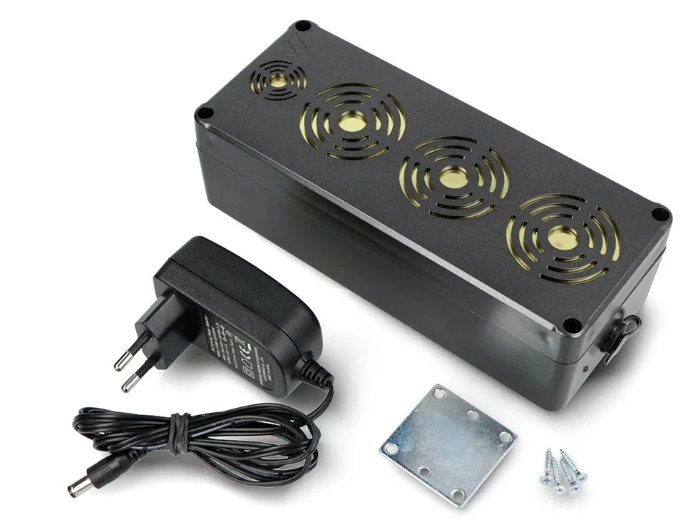 Zařízení je napájeno z 2x dobíjecí baterie Li-Ion 2000mAh (4000mAh) s výdrží až 200 dní, která se dobíjí 12V adaptérem (součástí balení). Dobíjecí zásuvku lze uzavřít gumovou krytkou, které ji chrání před nepřízní počasí. Odpuzovač disponuje praktickými vypínači v ochranném pouzdru, díky kterým můžete plašení jednoduše vypnout a zapnout, jak ultrazvuk tak i záblesky, bez nutnosti vypojit adaptér ze sítě.