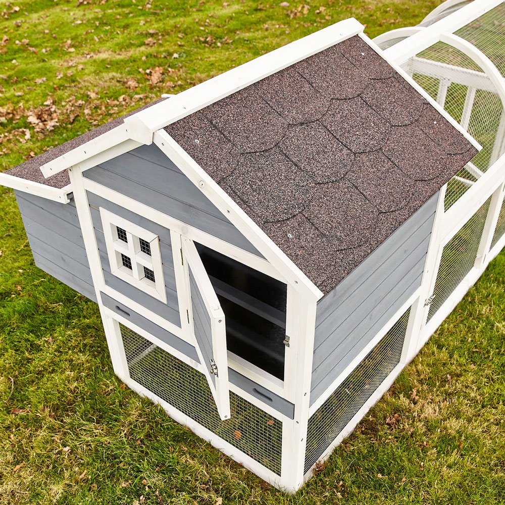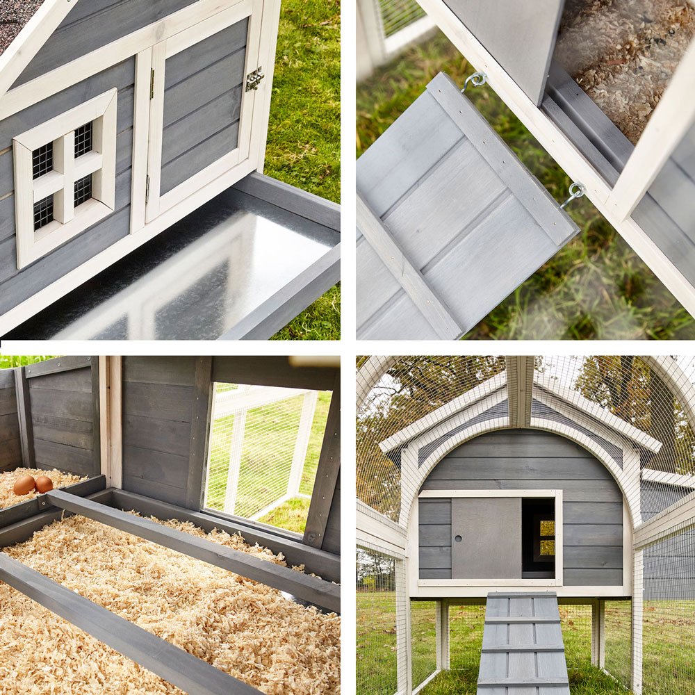 Kurník s opravdu neobyčejným designem bude ve Vaší zahradě tou největší chloubou. Z boudy se vaše slepice dostanou přes žebřík do výběhu, který je oplocen kvalitním pletivem. Takže jsou plně chráněny před útokem dravců. Samostatná hnízdící skříňka se dvěma hnízdy poskytuje Vašim kuřicím útulné a příjemné místo ke snášení vajíček, nebo k odpočinku. Samostatná dvířka do snášecí skříně umožňují okamžitý sběr vajec nebo vyčištění hnízd.