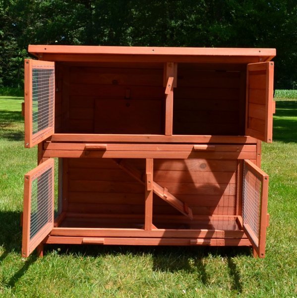 Díky čtyřem velkým dveřím a odklopné střeše získá chovatel komfortní přístup k doplnění jesliček senem, misek s krmnou směsí a pítek s čerstvou vodou.  Celodřevěná, proti plísni ošetřená konstrukce zajistí  bezpečné zázemí všem vámi chovaným ušákům, navíc díky stabilním nožkám je dřevěný kotec chráněn před přízemním vlhkem a chladem.